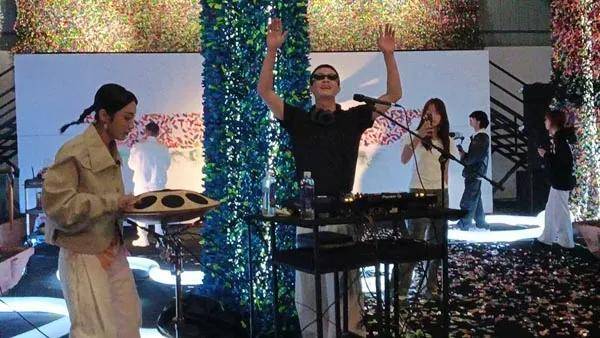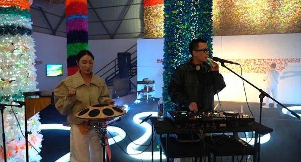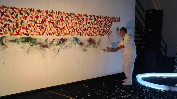 随后,古原携手矩阵Matrixx电子乐队,打造了一场“艺术展览+电子音乐”的沉浸式艺术实验。花彩爆破艺术家、美术馆馆长古原在演出中即兴创作,其标志性的“花彩艺术”与乐队的电子韵律展开深度对话。矩阵乐队成员——制作人林栩与手碟演奏家周小敏,将电子音乐的灵动韵律与疗愈元素巧妙融合。林栩曾代表中国参加世界BEATBOX锦标赛,周小敏作为尼泊尔国际认证音疗师,其空灵的手碟音色为现场营造出独特的冥想氛围。在演出达到高潮时,古原完成了其特有的“花彩艺术”创作,色彩在爆破瞬间绽放,与电子音乐形成完美呼应。