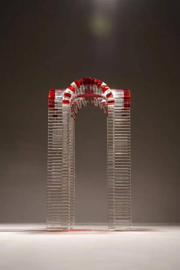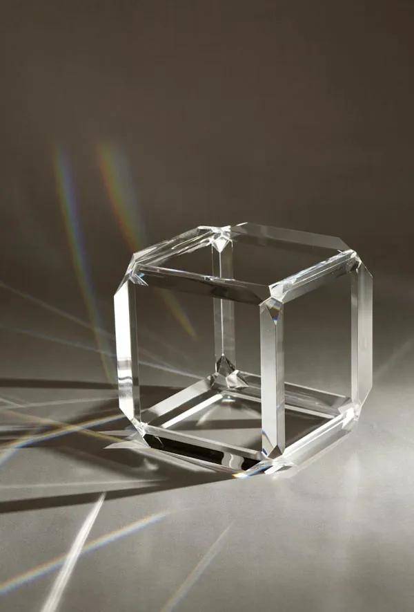 在《映》系列中,蔡志松展现了从宏大叙事向精微内观的形式蜕变,作品呈现出两种相辅相成的面向:比如作品 《天际》,那座11层镂空的锥形水晶塔,以其层层递进、指向“天际”的尖锐结构,在“简洁利落的几何感”中,蕴含着一种理性的秩序与精神的向上感。它通体“通透”,却又能在灯光下迸发出“填满整个空间的绚烂光彩”。这完美诠释了艺术家所追求的“坚实却轻盈,允许一切穿过,又自有璀璨光华”的生命状态。它既是物质的塔,更是精神的塔,象征着在历经层层修炼与提纯后,内心所能达到的既澄澈又光芒四射的境界。