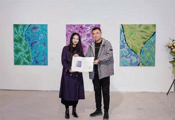 赵煜亚发言时对到场的来宾和老师们表达谢意,她表示非常荣幸能成为花彩(丽江)美术馆的首位驻地艺术家,在丽江驻地的两个月,自己收获颇丰,既喜悦又轻松。“本次展览所呈现的24件综合材料作品均为在地创作。羽毛、豹纹、珍珠、亮片这些材质在过去的使用中彰显着辉煌与神圣,经过工业文明的消解,它们在今天已经演变成了消费主义景观的装饰性语素。我创作中重要的构成是‘模具’。它来自于我对成长环境的思考。我将自己作为人的个体,放置在社会洪流当中,去观察和思考问题,并发现现代社会中,模具是非常重要的主力军。作品中的漩涡、沼泽、离岸流等,都具有很强的隐蔽性、突发性、不可预见性,它们暗藏在波光旖旎的海面下,却有着巨大的能量,能吞噬一切卷入的事物。选择这样的形态,其实也是为了让自己去反思作为一个个体,该如何才能跳出浪潮去看清本质。此外,丽江秀美的自然环境激发了我对于‘俯瞰’视角的强化,让我对抽离本我有了进一步的体验。这边绚烂的阳光让我在色彩上也有了更新的尝试。”