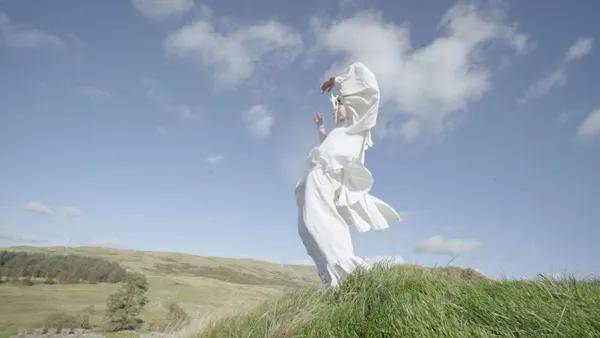 不同的神话源自不同的文化,它们在时间与空间中流动、演化。作为来自斯里兰卡的第二代移民,阿诺希耶·雅内尔(Anushiye Yarnell)对这片土地既感到亲切,又感到陌生。通过她的跨学科表演,艺术家重新诠释了威尔士神话《布洛德维德》(Blodeuwedd)—— 一个关于威尔士花之女神的故事,并在幻想与现实之间建立起联系。这场表演在威尔士的多个地点展开,所有场地被整体视作一个统一的戏剧性空间。艺术家身着白衣,佩戴花饰面具,在显露与遮蔽之间展现出女性原型的多重面向——一个犹疑或焦虑、抗拒或坚定的形象,演绎着人类在自由与界限、欲望与克制、纯真与感性之间的矛盾与挣扎。除身体动作外,背景中朗诵诗性文本的女性声音也构成视觉叙事中不可或缺的一层。亚内尔以梦幻般的方式展开艺术思考,并以亲密的语调传递情感。植根于威尔士的语境之中,她通过身体与场域的互动,重新审视浪漫、爱情与道德的概念,探索那些既哀伤又珍贵、既虚幻又真实、既本土又具有国际共鸣的情感经验。