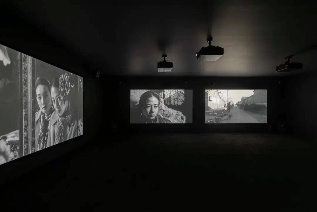 杨福东,《香河》(剧照),2016-2025,15频黑白数码影像装置。主演:谭卓(中间)、吕聿来(右一)、汪飏(右二)。图片由杨福东工作室提供。