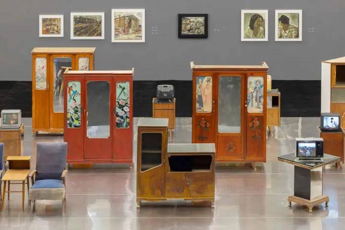 装置《哺乳期》(2025)的主体部分由上世纪80至90年代香河地区常见的旧家具和旧电视机组成,真实的影像记录让私人记忆延伸至具身空间。家具被不同明暗度的镜面和玻璃覆盖,观众仿佛置身于一个如园林般幽微、时间失去坐标的流动空间。而旧电视机中播放着2000年初艺术家从上海回到香河老家拍摄的真实生活记录的影像,这些未经布置的画面似乎构成了《香河》的某种前身。