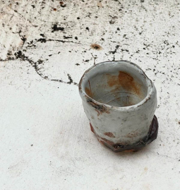 相比之下,《法雨2.0- 白》更克制、更轻盈。作品主体的灰白釉面像是被雨水冲刷后的岩壁,而底部未经完全覆盖的土壤与烧制的痕迹,则像是时间从杯子内部渗出的痕迹。它不像《法雨2.0- 红》那样激烈,而是以一种近乎“未完成”的姿态呈现。
