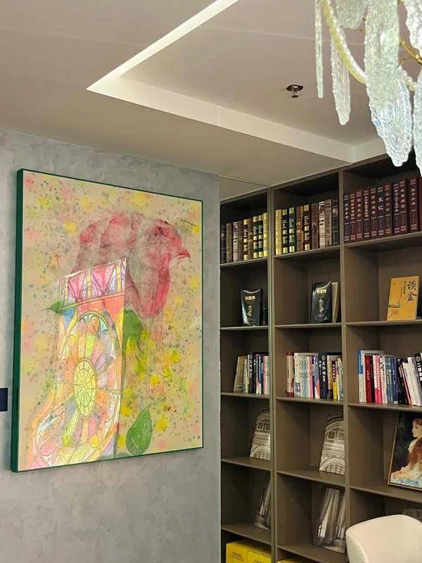 华灯系列,是光与色的哲学。吕美运用西方绘画强烈而富有张力的色彩,描绘的却是东方语境下“灯”的意象。那不仅仅是物理的光源,更是希望、指引与精神觉醒的象征。在意大利的语境中,光承载着文艺复兴以来对人性的颂扬;在东方的智慧里,一盏明灯常喻指觉醒开悟。作品中流动的鲜艳色彩与交织的光影,如同餐厅中温暖的灯火,意在照亮每一位观者的内心角落,提供一种视觉上的温暖与救赎。