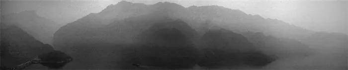 《攀枝花》(2012)拍摄于被誉为“万里长江第一城”的攀枝花市,作品视角由被群山包围的工业城市边缘延伸,建筑与山脊构成两个相对的三角形几何结构,使城市与山体不再对立,而是彼此呼应与对照。在《虎跳峡》(2012)一作中,艺术家以俯拍的取景方式将远山的水平线与江水共同塑造出一个略带错位感的空间;展览特别将该作品横向铺陈于一张弧形布条之上,而非采用竖向壁龛式陈列,还原了拍摄视角所蕴含的空间感和江水湍流而下的速度感。而在上海长江大桥拍摄的作品《海门》(2012)画面中,长江入海口的宽阔江面几乎消解了地平线,只有近处右下方一艘意外闯入的运沙船成为时代的痕迹。