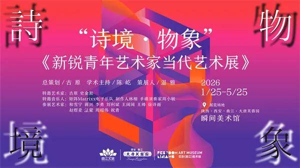 “诗境·物象——新锐青年艺术家当代艺术展”将持续展至2026年5月25日。欢迎广大艺术爱好者莅临西安曲江大唐芙蓉园·瞬间美术馆,步入这场由物象构建的诗境,共同领略传统与当代碰撞出的艺术魅力。