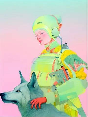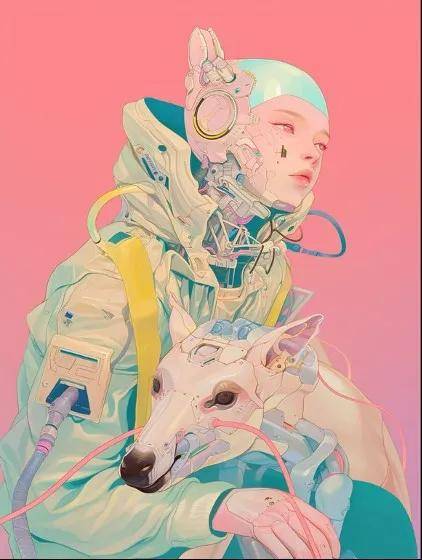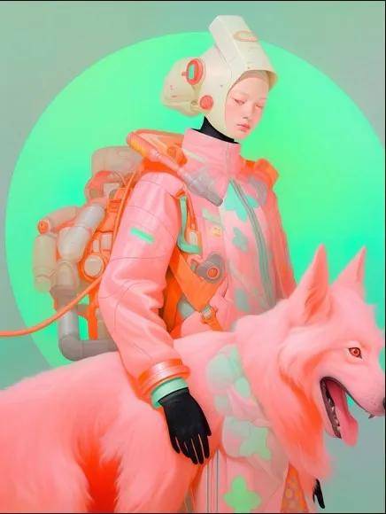 在《Space No.3》中,一位女性和动物的躯体,各自通过多股电缆与机械相连,连接方式紧密不可分;情感、能量、信息在同一时空中流动,却始终无法整合为一个稳定的“主体”。这种处理让我想起 Donna Haraway 晚期对伴生种(companion species)的说法,也让人联想到 Pierre Huyghe 那些拒绝被命名的生物和技术混合体。然而武旌不止于人物造型上的想象,他让色彩也保持一种不稳定的冲击力(尤其在 No.4 中,桃红与荧光绿色的强对比),从而把画面本身变得更有冲突。