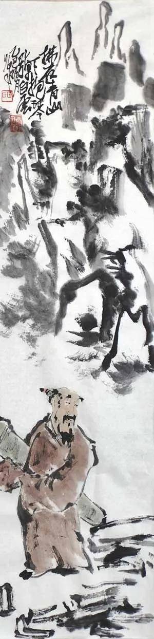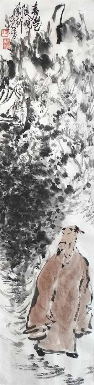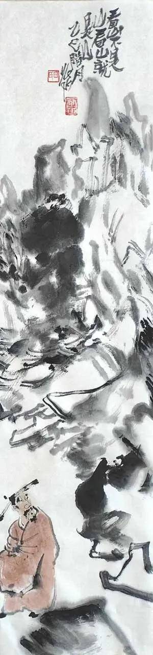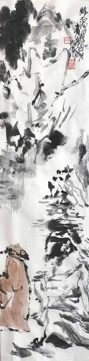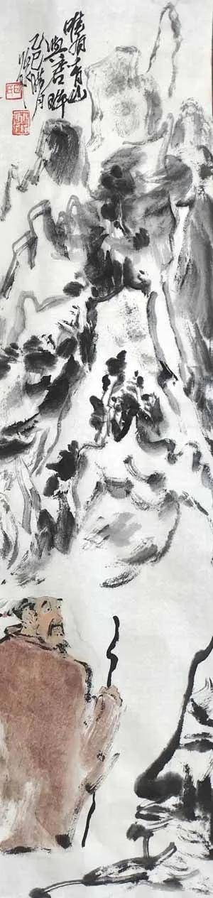 笔墨之道,贵在写神。 画家深谙“以形写神”的传统精髓,画中山石素墨泼写,浓淡干湿,勾皴点染,自然天成,泼墨处苍茫浑厚,飞白处空灵通透,既有石之嶙峋,复得水之温润,不求具象,只取意蕴。画中老者,身着赭袍,或手执竹杖,或信步纵游,或翘首凝望,或颔首沉思,神态悠然,气定神闲。面部数笔点染,衣纹粗放勾勒,承袭梁楷“减笔”遗风,不求形似,唯求神韵。题款遒劲,朱印两点,既平衡画面,亦添文人雅趣。