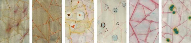 先来看中国历史上的园林与山水画,两者如何体现人与自然的关系。造园体现“城市山林”,即山居两兼的自然主义生活方式,它要将山林的自然意象压入城市的起居生活。山水理论的核心是山居意向的位置经营,从自然山水风景中萃取密集的山居意象。园林建筑的抽象概括设计方法,与绘画抽象概括并以视觉效果呈现的行为相似。宏观来讲,絮菲的创作思维是从自然风景中精简出色彩和视觉元素,将其概括并在画面上重组,比如她在2024年初创作的树和山石系列(上图),由写生出发,回到工作室后凭印象进行创作。这也许就是王欣所说“园林,是如画的,出于诗的,不是对纯自然的复制与照搬,而是内心世界与自然的比照,是对自然的重新分类与心理设想。”中国园林由几何式的人工部分和未经修建打磨的天然材料共同组成,对应到絮菲的绘画中是重复循环的几何纹样和自由分散如落在画面上的色点和短线条。