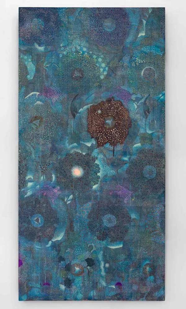 乔絮菲的艺术探索一直围绕着三个母题:自然、纺织纹样、文化遗产,它们之间又互相存在千万种联系,与艺术家自身的文化背景、专业经历及生活感悟深深连结在一起。从2024年的牡丹系列(图1-图4)反映出,乔絮菲的创作心态与茶壶时期的尚扬不谋而合,在画面中,作为丝绸图案的牡丹花逐渐瓦解,流动、聚散,形成新的秩序。也正是此时开始,絮菲将创作重点转向对文化符号的理性思考,在历史的长河中抛下一只船,探索新的航线。