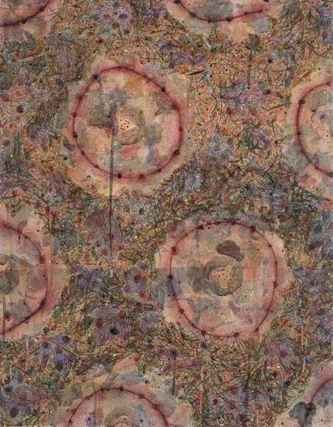 如金秋野所说:“文字是思维的跳板,因此,中国人在构思任何人造物品时,不自觉地遵循与造字法类似的组织原则,也称为‘模件化’。”的确,汉字就像平面的建筑,中国园林建筑也可被理解为带有汉字造字规律的三维空间的排列。絮菲通过创作视觉图像表现事物的内在秩序和构造,与中国园林建筑理论互为表里。并且,“文字视角”的加入成为她创作更加丰富的一个重要因素,从陶纹(图9)、牡丹8号(图4)都能看到细小的书写性笔触,像飞鸟交叠在一起的身影,犹如篆书的笔划和象形文字符号。她以这些无语义的书写表达为支点,像搅碎机一样打碎形和线条,并尝试用笔触分子创造一种新的视觉语言。絮菲在2025年末创作的一系列纸媒作品(图7),也是受水墨文化、书法的书写章法影像,将其抽象、夸张得来的视觉体验。它们来源于已知的文字与图像,但又处在无尽的变化中。在玉琥1号(图11)中,细密的线条像分子在形之间流动,如溪水流过石缝留下的波纹颤动,如游离在建筑之间瞬息万变的云雾,也如同曲水流觞的园林设计哲思。