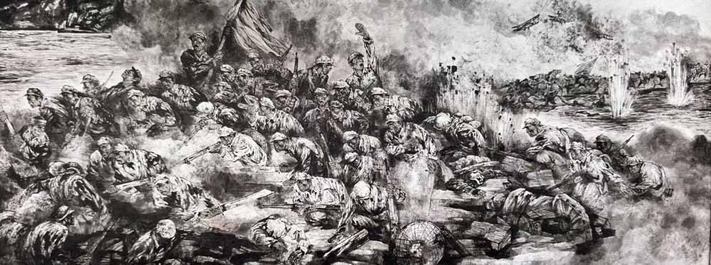 画面的构图极具匠心,康移风以湘江为背景,将红军群像置于画面中央,形成视觉焦点,背景中硝烟弥漫的群山与湍急的江水,既烘托出战场的紧张氛围,也衬托出红军战士们不畏艰险、奋勇向前的英雄气概。他巧妙地运用留白与浓墨的对比,让画面既有厚重的历史感,又有灵动的艺术张力,浓墨渲染的红军身影与留白的天空、江水相互映衬,更凸显出红军战士在绝境中坚守信仰、奋勇拼搏的精神内核。敌机的轰炸、炮火的硝烟、流淌的鲜血,都通过简洁而有力的笔墨得以展现,没有刻意的煽情,却每一处都令人动容,让观者仿佛穿越时空,置身于那个战火纷飞的年代,亲眼目睹红军战士们为了信仰、为了革命,不惜抛头颅、洒热血的悲壮场景。