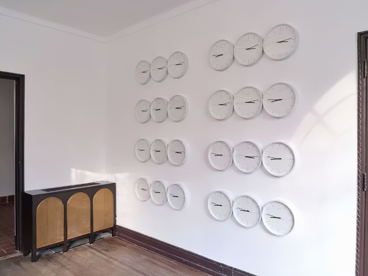 廖斐,《对称》,24个钟表,展览尺寸可变,2021年。“廖斐:外在”展览现场,花厅计划,2021年12月19日—2022年2月28日,上海市徐汇区复兴西路62号修道院公寓二层。图片由艺术家、花厅计划与Vanguard画廊提供
