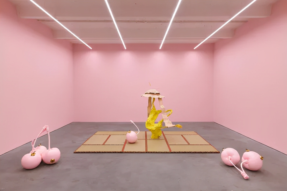 《Kikachick正向着那在深 蓝暮色中照应着灯光微微 发粉的落雪冰面的舞台迈 出第一步 》 关小 黄铜,丙烯烤色,榻榻 米,漆,干稻草,油箱盖 180 × 470 × 380 cm 2021 图片由艺术家和Kraupa - Tuskany Zeidler提供,摄 影:def image