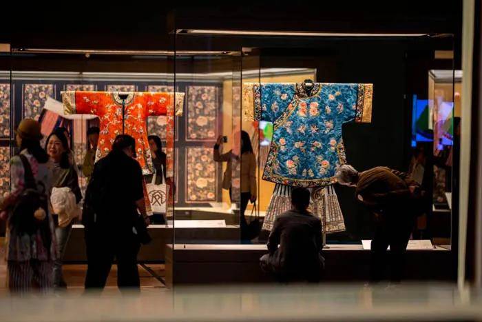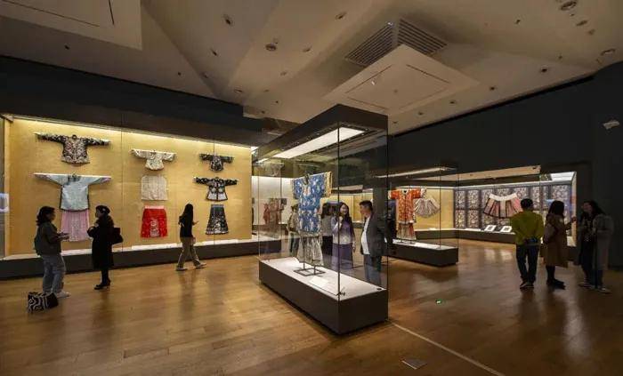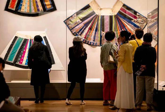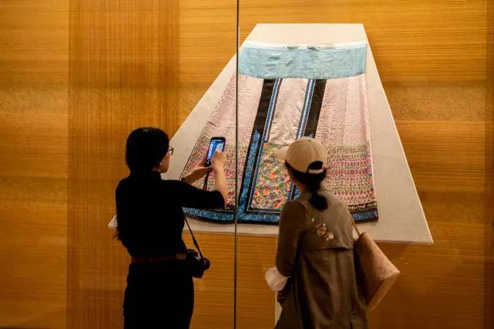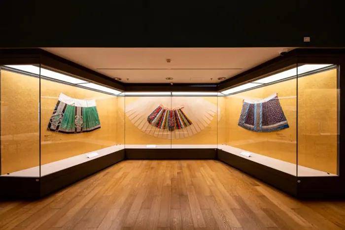 马面裙是中国传统服饰中十分经典和极具代表性的裙装,其历史悠久,外形独特,款式合理,工艺精湛,凝结了美用一体、以文载道的人文思想。本展依据传统马面裙的美学演变为划分,始以序篇形式呈现出马面裙的形制起源,后以马面裙的定形与发展为题,共分为三个单元展出66组件展品。第一单元“方兴未艾”,展示了明代马面裙及其同期的袍,袄等,力图呈现出明代马面裙的着装风采。第二单元“百紫千红”,展示了清代的阑干、月华、凤尾及百褶鱼鳞裙,辅以袄、褂,马面绣片等,呈现出清代丰富的裙型与华美的装饰。第三单元“简雅凝练”,展示了20世纪初在西风东渐下,马面裙形制及装饰上的简化。近年来,马面裙以其独特的魅力再度吸引了众人的瞩目,当代设计师以传统马面裙为灵感进行传统重构,赓续了华裳故事;这不仅是对传统裙裳之美的承继,也是今人对自我身份的认同。