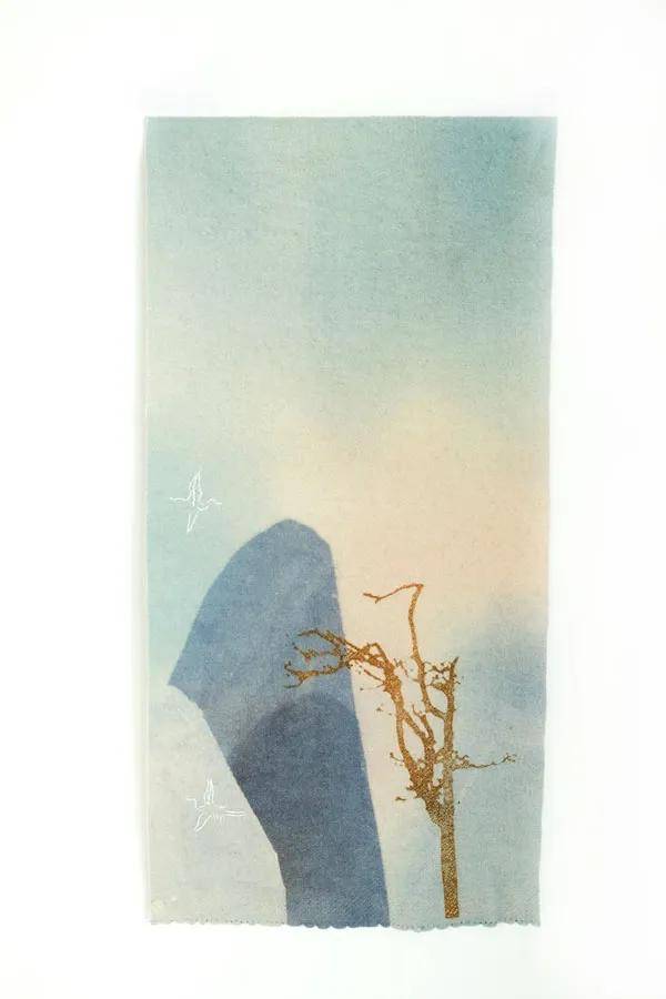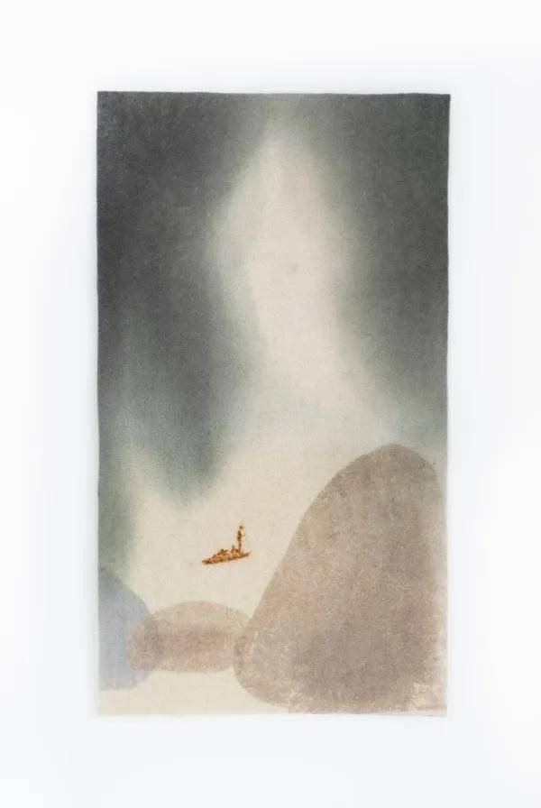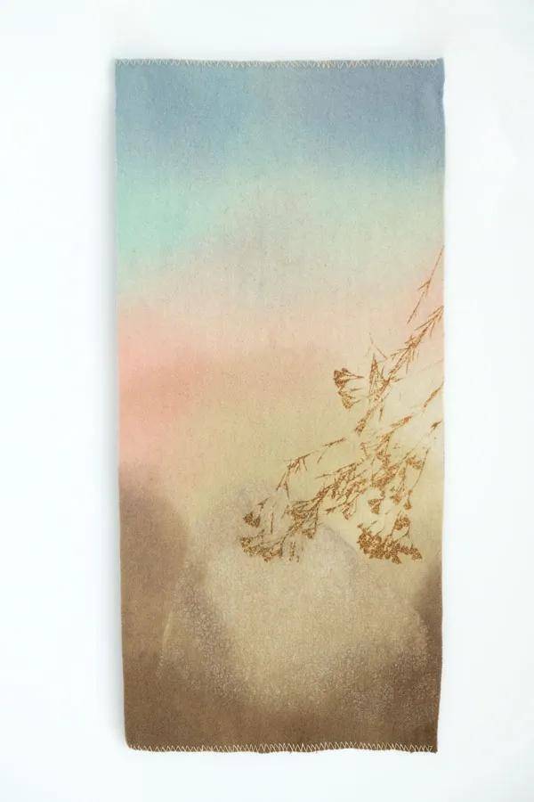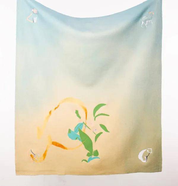 视觉层面上,邬皓婷采用唐三彩色系与山水画中的留白方式。黄色、绿色与蓝色在织物表面形成雾化层次,空间通过渐变展开。山体、舟影与人物轮廓体量微小,位置疏离。图像处于半隐状态,随光线与距离发生差异。比如:在《Roby’s Garden》(2024)中,画面呈现一块约67 × 88 厘米的羊毛织物。整体色调以黄、绿与蓝的渐层为主,染色在布面形成柔和过渡,边界呈雾化状态。中央区域可见以数字刺绣完成的狗的剪影,白色细线勾勒轮廓,线迹密集而克制。织物上部两角出现较为明确的蓝色天空区域,与下方偏暖色的“土壤”色域形成纵向空间关系。局部表面带有轻微压痕与纤维起伏,触觉层面可感知织物的柔软与厚度。图像并未追求高对比度,形象在色层之中保持半隐状态,且留白扩大了视觉停顿,使观看节奏和整体视觉重心趋于缓慢。