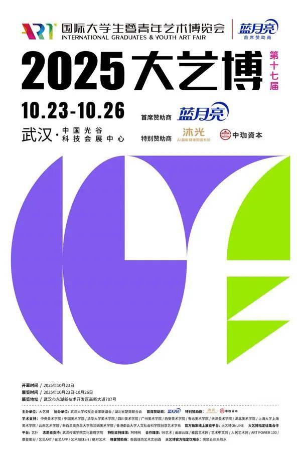 10月23-26日,由大艺博主办,武汉大学校友企业家联谊会、湖北省楚商联合会协办的第十七届国际大学生暨青年艺术博览会(简称:大艺博),将携全球20个国家近500位艺术家2000多件优秀作品,在中国光谷科技会展中心与武汉市民见面!秉持推动中国青年创新力量成长及助力武汉城市文化建设的两大初衷,中国知名日化品牌蓝月亮成为本届大艺博的首席赞助商;AI智能健康照明行业领先品牌沐光、中国知名投资机构中珈资本成为本届大艺博的特别赞助商。
