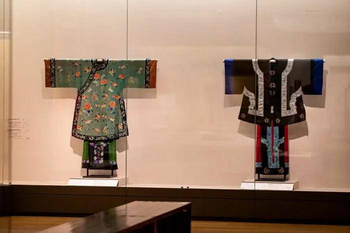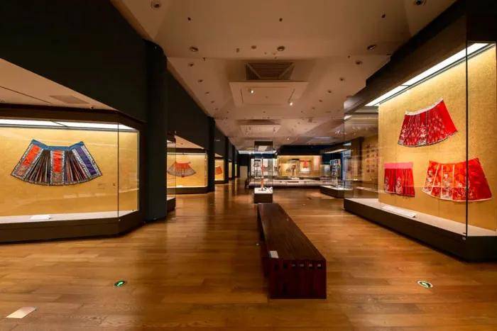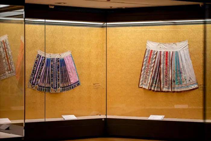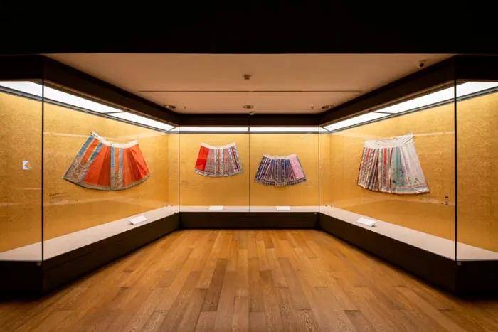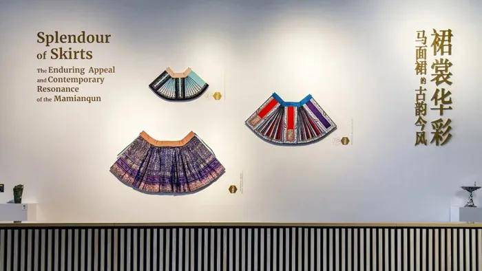 马面裙是中国传统服饰中十分经典和极具代表性的裙装,其历史悠久,外形独特,款式合理,工艺精湛,凝结了美用一体、以文载道的人文思想。本展依据传统马面裙的美学演变为划分,始以序篇形式呈现出马面裙的形制起源,后以马面裙的定形与发展为题,共分为三个单元展出66组件展品。第一单元“方兴未艾”,展示了明代马面裙及其同期的袍,袄等,力图呈现出明代马面裙的着装风采。第二单元“百紫千红”,展示了清代的阑干、月华、凤尾及百褶鱼鳞裙,辅以袄、褂,马面绣片等,呈现出清代丰富的裙型与华美的装饰。第三单元“简雅凝练”,展示了20世纪初在西风东渐下,马面裙形制及装饰上的简化。近年来,马面裙以其独特的魅力再度吸引了众人的瞩目,当代设计师以传统马面裙为灵感进行传统重构,赓续了华裳故事;这不仅是对传统裙裳之美的承继,也是今人对自我身份的认同。