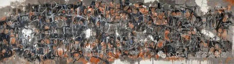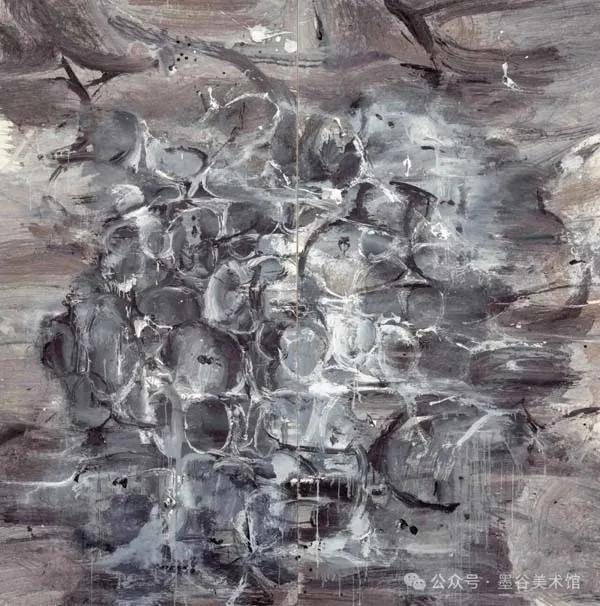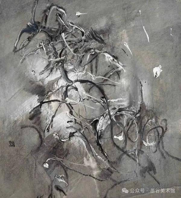 徐善循将自己的抽象绘画命名为“鸿蒙系列”,该系列开始于2023年。经过十多年的锤炼,这类创作已臻成熟。“草木灰线”是徐善循发明的用于创作抽象绘画的材料和形式,通过这种独特的材料和形式,他创造了一种新颖别致的抽象绘画风格。黑白线条依然是这类抽象绘画造型的骨干,而作为画面的背景或基底,徐善循采用了包括水墨晕染、油彩厚涂和丙烯滴洒在内的各种手法,营造出一种宇宙苍茫、鸿蒙未开的超现实意境。
