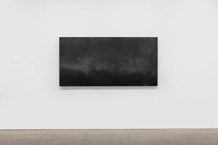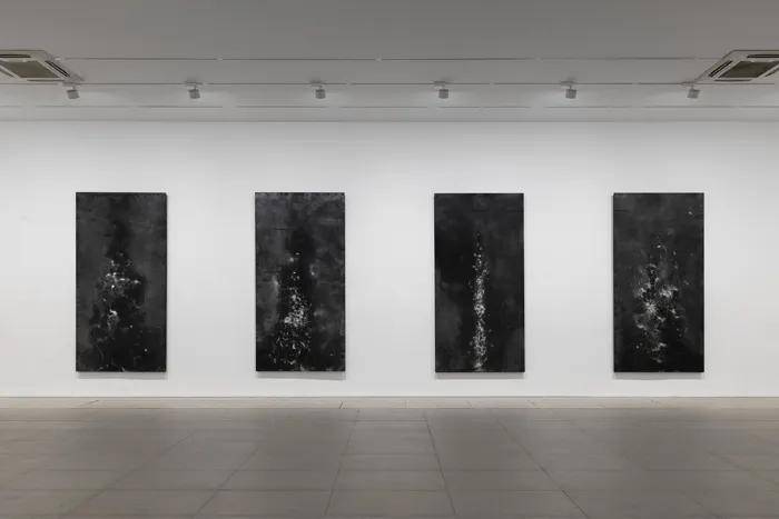 油墨在铝板上流动,生成,浸染和覆盖,随着铝板表层的细微起伏而变化,它也就此铺开了深浅不一的黑白世界。这个质朴的黑白世界没有故事的夸张引诱,但却有一种凝重和神秘的时间考古。它抽象的图案并不意味深长,我们甚至可以说,在这里试图寻找某些象征或者隐喻意义是徒劳的,它的重心甚至不是类似于波洛克式的行动绘画:与其将它说成是接近抽象表现主义的任意滴洒,不如说它是油墨,电动工具,砂纸,铝板这些物质材料之间的竞赛嬉戏。