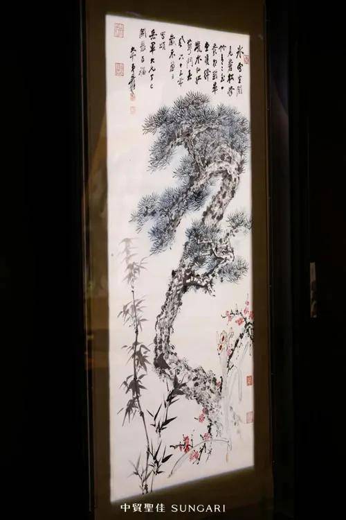 晚年,张群更是鼎力协助张大千回台定居、兴建摩耶精舍、安排医疗团队,处理其身后事。张大千为答谢张群协助兴建摩耶精舍而作的《开岁百福图》,以松树、吉祥花卉等题材,在离开美国前的最后一个除夕精心绘制,表达其最深切的感恩。据统计,在摩耶精舍时期的1675天里,两人见面多达575天。张大千每年唯一会亲自登门拜年的对象就是张群,这份友谊成为艺术史上的一段佳话。