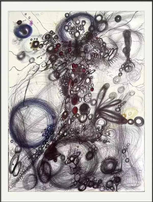 圆珠笔、墨水笔和橡皮泥是成明远从童年沿用至今的材料。圆珠笔的密集线条和可无限叠加的特性让他感到自在。他可以连续不断地推进画面而无需中途停顿,这有助于维持他进入“放空”状态。在他看来,圆珠笔作品最贴近宇宙本源,也是能量感最清晰的表达方式。