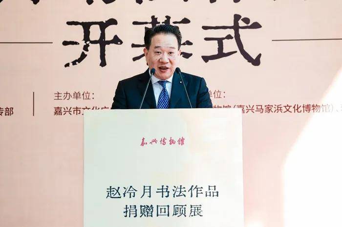 赵冷月先生的家属代表赵时中在致辞中对各级政府部门和相关工作人员的支持与帮助表示感谢。他回顾了十年前为实现父亲“回馈桑梓”的心愿,精心甄选了百件父亲的书法遗作无偿捐赠给家乡博物馆,并表示今年恰逢父亲诞辰110周年,这份捐赠不仅是对父亲的思念与敬意,更是希望将父亲挚爱的书法艺术作为文化礼物,奉献给家乡人民,助力嘉兴地域文化的传承与发展。他还提到,父亲深深扎根于嘉兴,这片水土赋予了他厚道质朴的品性,也沉淀了他对家乡的深厚情感。如今,这些作品回到家乡,不仅是对父亲艺术生涯的一次回望,更是他与家乡之间的深情对话。