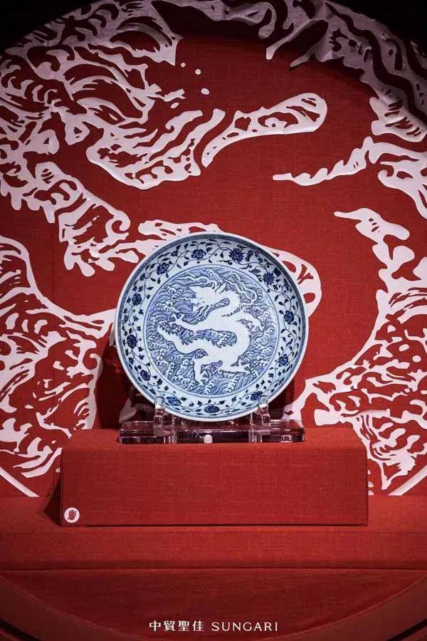 这件源自丹麦著名建筑师塞伦森旧藏的大盘,是市场流通中仅见的孤品,另有两例藏于伊朗国家博物馆,上海博物馆藏一例宣德年款者外,传世完整器仅此一例。其纹样更被学者认为与永乐皇帝御容神似,龙须分叉的样式独一无二,不妨驻足细观。