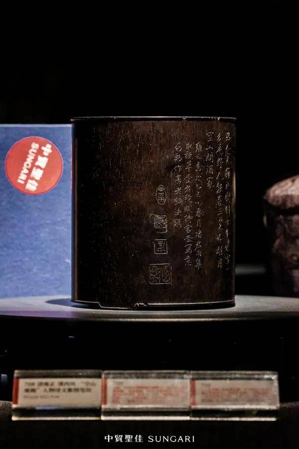 一件明拓《研山兰亭》拓本上,更是挤满了徐渭仁、张廷济、何绍基等十几位道光年间名家的题跋和印鉴,宛如道光年间江南文人圈的一场“线下聚会打卡记录”。清代名匠潘西凤“空山寒梅”人物诗文紫檀笔筒,则生动记录了清代扬州艺苑的风流雅集:雍正乙巳年小春月,朱冕(老匏)赋诗、蔡嘉(雪堂)写意、汪宏(药溪)作书、潘西凤(老桐)镌刻的合作过程,四位名家各展所长,共冶一器,堪称文人协作的典范……