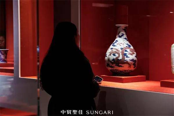 瓷器板块作为中贸圣佳的优势领域,300余件重器组成“瓷苑华章”,展区内藏家扎堆。核心焦点当属“璀璨—古代艺术珍品夜场”的明永乐 青花缠枝花卉海浪留白暗刻龙纹大盘,这件直径达40.2厘米的朱棣御物,来源清晰有序,浓艳青花与灵动龙纹将永宣时期的皇家气派展现得淋漓尽致,观者无不驻足凝视其御制底蕴。