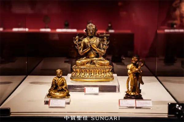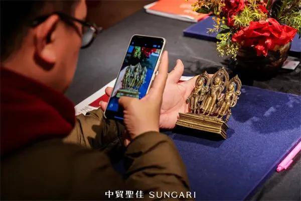此外,璀璨夜场的王世襄旧藏戟耳炉、清乾隆五福五代堂款石鼓贡砚,文房专场的五彩灵璧石“祥云”与金西厓刻 张大千、溥儒画 高士水仙图扇骨,明清家具区,清早期黄花梨螭龙纹衣架雕工精湛,独板面翘头案木纹光泽温润......藏家们纷纷围站交流,俯身近距离观赏品鉴。佛像区同样高能,11世纪大理杨柳观音坐像尺寸硕大、鎏金厚重,永宣宫廷造像细节精美,15世纪西藏银嵌宝石白度母像造型完美,形象庄严,工艺精细,让佛像艺术爱好者流连忘返。