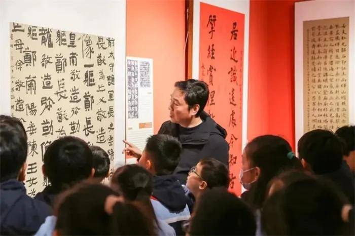 参观过程中,刘灿辉讲到,“学习书法,贵在‘取法乎上”,精临深悟,方能入古出新”。他带领学生们依次参观了展出的百余幅书法作品,领略了从古朴的篆书、雄浑的魏碑到典范的唐楷(如颜体)等多种书体脉络,其中对北魏时期的“龙门二十品”进行了特别讲解,引导同学们从《杨大眼造像记》到《始平公造像记》等经典作品中感受石刻书法的魅力。面对孩子们提出的各种问题,刘灿辉以浅显易懂的语言一一解答。他特别强调了书法学习的规律,“先临摹,再创作”。经典很多,要学会找经典、学经典,选自己喜欢的去写。 这种互动式的讲解,使原本高深的金石书迹变得亲切可感。