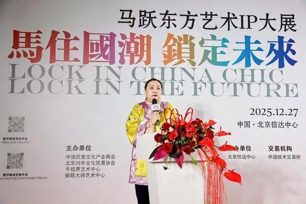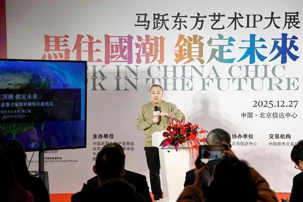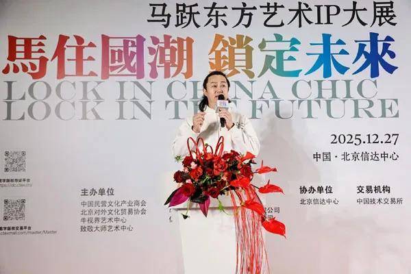 2025年12月27日,“马跃东方”艺术IP大展在北京信达中心开幕。本次展览以“马住国潮 锁定未来”为主题,由中国民营文化产业商会、北京对外文化贸易协会、牛视界艺术中心与致敬大师艺术中心联合主办,并特邀中国技术交易所作为交易机构,集中呈现画家三川创作的百余幅“马住”系列作品。展览不仅是一场融合传统美学与当代潮流的视觉盛宴,更是一次通过数字版权存证与交易赋能文化IP的创新实践,标志着国潮艺术从实体展示迈向数字资产化运营的关键跨越。