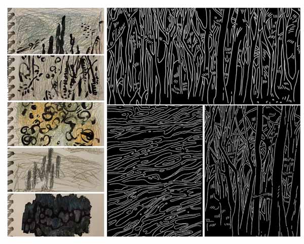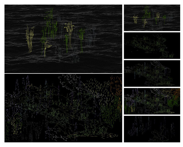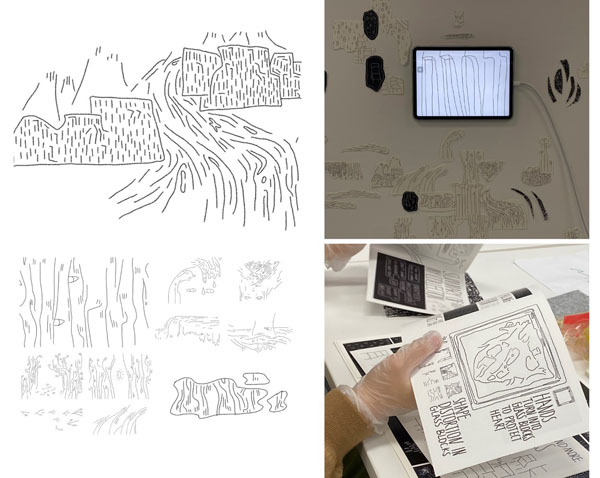 而在关于空间的思考,任天宇特别重视「流动性」的讨论与二象性:物理意义上的确定地址,以及历史注记上的注记与抹除。两者在她的作品画面上,形成了一种吊诡的平衡。观者在作品中看见的,并非只是单纯的特定遗址的再现,更多的是关于时过境迁「温度」的感性觉察,历史痕迹与艺术家情感的相互缝合。在《Imagined Woods》中,那些反覆出现的黑色树木与水流线条,并非单纯的写实再现,而要投射着艺术家个人经验以及在教育历程中,觉察到的「理想化的河畔」想像。另一方面,动态影像作品《Drifting through Imagined Light》则更进一步,展现了生机勃勃的风景如何逐步破碎、坍塌,最终收束为一条单调而持续的河流。这种从丰盈到消解的过程,呈现了理想想像在现实面前的苍白与无力,使观者进入一种由抽象不安所建构的感性空间。