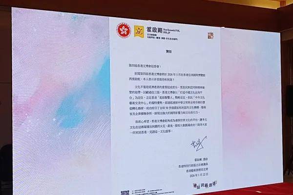活动现场,香港特别行政区立法会议员、香港艺术发展局主席霍启刚发来贺信祝贺第四届香港文博会的再度启航,贺信中提到文化不仅是经济产业的重要组成部分,更是民族认同与精神凝聚的纽带,希望香港文博会能成为连接世界文化的平台,让多元文化在这里碰撞出绚丽的火花。