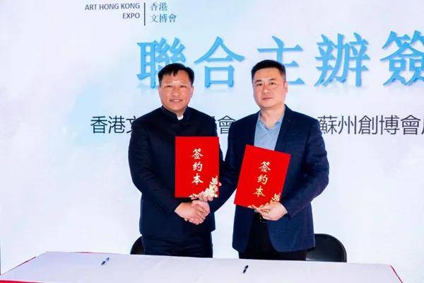 (图为:第四届香港文博会合作签约仪式 ,左为:香港文博会组委会执行主席皮取兵,右为:苏州国际博览中心管理有限公司副总经理/苏州创博会展览有限责任公司总经理叶喜春)