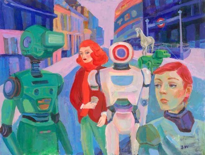今年在 IP Shanghai 策划的那场“艺海漫游: 上海与世界的创意对话“的联展上,他的《A night out in Piccadilly Circus》(80 × 60 cm,布面丙烯)又让我有看到了带有他个人风格的“冷笑话”: 把荒诞推向都市日常。机器人与人类在霓虹灯下并肩而行,好像再自然不过,直到一匹白马从地铁入口一跃而出,有着某种象征的意味,也有点像伦敦深夜醉汉断片后的回忆。马的出现则打破了画面的安静,却没有提供任何解释。看着这画面,我忽然意识到: 当类人机器彻底成为街头背景,我们对城市的真实体验是不是已经被悄悄替换了?武旌沒有給出答案,却让问题悬在那。