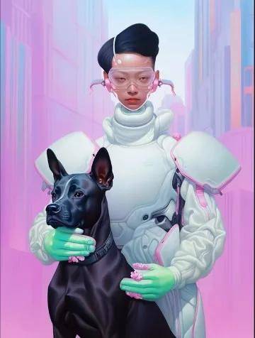 在《Space No.3》中,一位女性和动物的躯体,各自通过多股电缆与机械相连,连接方式紧密不可分;情感、能量、信息在同一时空中流动,却始终无法整合为一个稳定的“主体”。这种处理让我想起 Donna Haraway 晚期对伴生种(companion species)的说法,也让人联想到 Pierre Huyghe 那些拒绝被命名的生物和技术混合体。然而武旌不止于人物造型上的想象,他让色彩也保持一种不稳定的冲击力(尤其在 No.4 中,桃红与荧光绿色的强对比),从而把画面本身变得更有冲突。