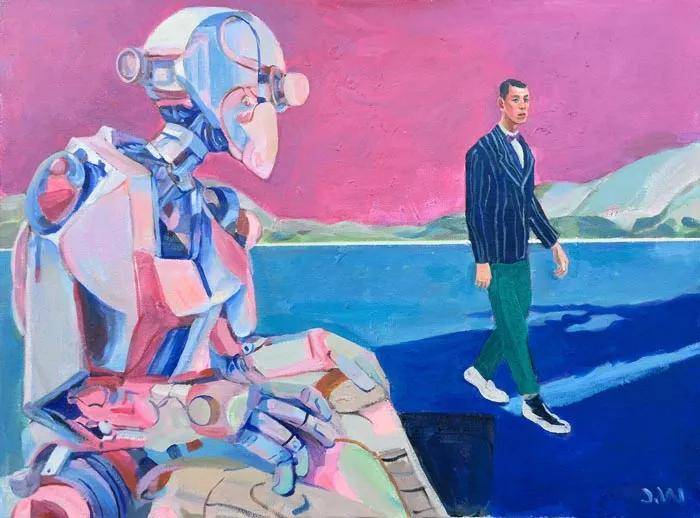 他最新的作品《The Waiter》(80 × 60 cm,布面丙烯)是一个典型的例子。前景里,一个大大的机器人坐在那儿好像等着什么,远处路过的,是一个穿着笔挺的人类。这一刻的时空好像被错位了: 机器在等,人在走。到底谁是侍者谁在被服务? 标题一语双关 (Waiter 在英语里既是等待者也是侍者)。这种叙事有点类似卡夫卡与贝克特式的荒诞韵味,但武旌没有让画面滑向说教。他只是陈述了一个场景,让观众自己在无声的对峙中感到有些冲突。如果说 Jordan Wolfson 也处理过人机关系带有一种幽默与恐怖,武旌的特别之处在于他让图像停留在静止状态,用对比和冲突给到观众去思考的问题。