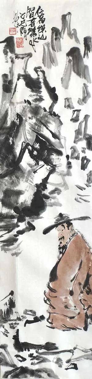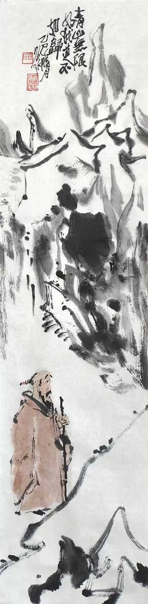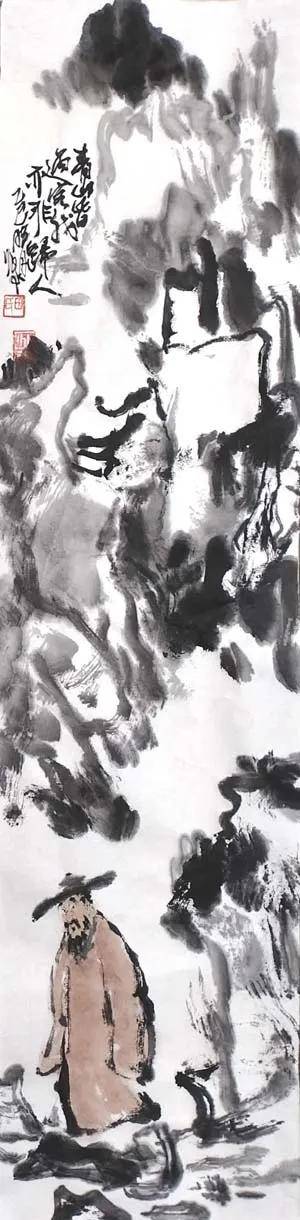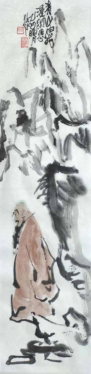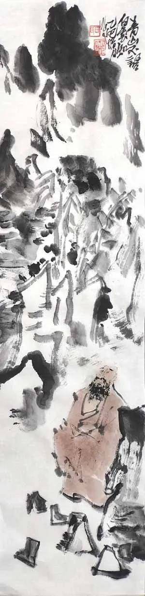 笔墨之道,贵在写神。 画家深谙“以形写神”的传统精髓,画中山石素墨泼写,浓淡干湿,勾皴点染,自然天成,泼墨处苍茫浑厚,飞白处空灵通透,既有石之嶙峋,复得水之温润,不求具象,只取意蕴。画中老者,身着赭袍,或手执竹杖,或信步纵游,或翘首凝望,或颔首沉思,神态悠然,气定神闲。面部数笔点染,衣纹粗放勾勒,承袭梁楷“减笔”遗风,不求形似,唯求神韵。题款遒劲,朱印两点,既平衡画面,亦添文人雅趣。