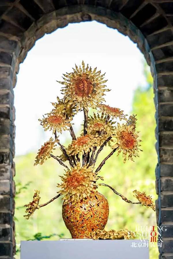 大秀以“熔”为核心理念,暗含“包容”之意。在秀场现场,朱炳仁的《燃烧的向日葵·国葵》《庚彩水果系列》《稻可道,非常稻》等经典熔铜作品同步亮相。“国葵”寓意代代向好,巨型“庚彩水果”象征秋日收获,吸引观众纷纷打卡拍照。走秀环节中,模特手持向日葵种子播种于土壤,与向日葵作品呼应,隐喻艺术的传承与绽放。