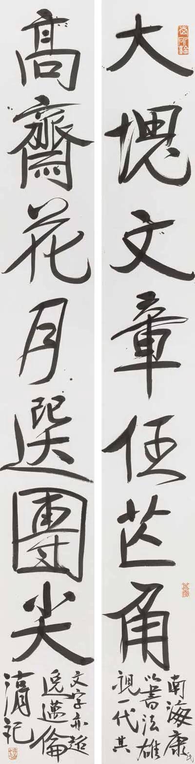刘彦湖《对联·大块文章任芒角,高斋花月选团尖。》,水墨纸本,245x30cmx2,2025