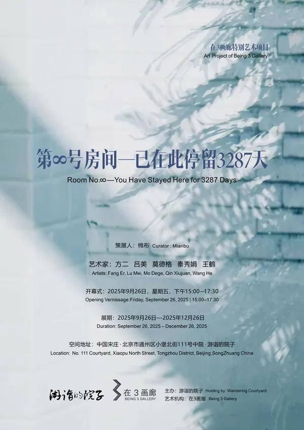 2025年9月26日下午,一场跨越时间、地域与媒介的艺术盛宴——《第∞号房间—已在此停留3287天》群展,在中国宋庄“游诣的院子”隆重开幕。本次展览由在3画廊创始人、诗人及策展人棉布女士策展,汇聚了来自台北、纽约、内蒙古锡林郭勒、天津及北京的五位杰出艺术家——方二、吕美、莫德格、秦秀娟、王鹤,共同呈现一场关于存在本质、永恒轮回与艺术生命力的多维对话。