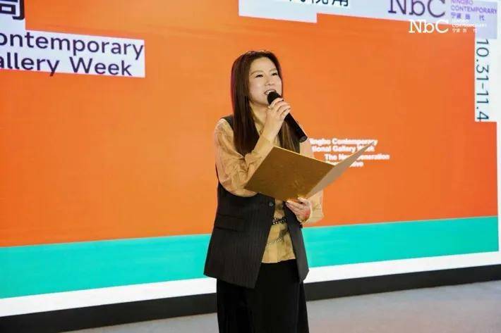 第二届宁波当代·国际画廊周(NbC 2025)开幕现场,纳艺思文化股东代表贺蓓芳发言。