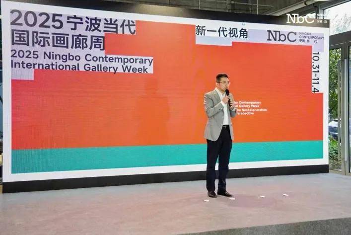 第二届宁波当代·国际画廊周(NbC 2025)开幕现场,宁波市文联主席杨劲发言。