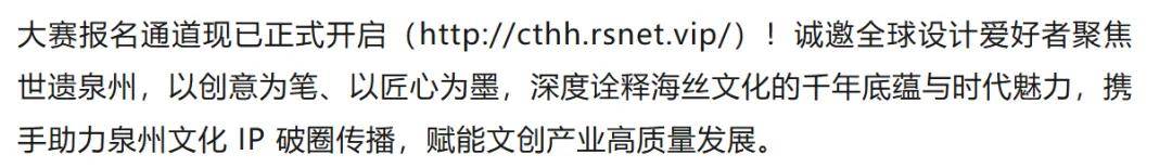 作为一场以 “刺桐海海,丝路创享” 为主题的文创赛事,本次大赛旨在孵化世遗泉州文旅吉祥物IP设计以及具有海洋气息和体现宋元中国海洋商贸元素的文创产品,推动世遗之城泉州的文化传播与文创产品落地,创新赛制设计和资源整合,打造具有国际影响力的文创赛事。本次大赛致力于推动世界遗产元素与当代设计语言、生活美学的创新融合,让泉州的城市精神及特质成为文创作品最鲜明的标识,助力泉州从“世遗之城”向“设计之城”跨越。