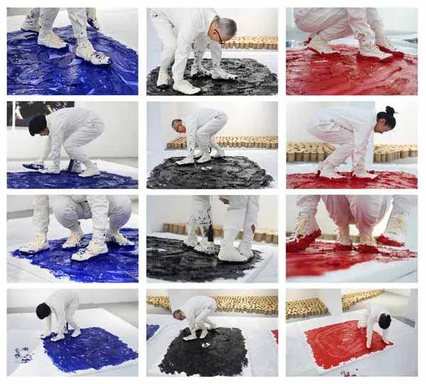 开幕式现场,艺术家杨烨炘邀请一男一女,将双手双脚都穿上鞋子,用四只脚作画。三人在沾满颜料的油画板上不断爬行,反复转圈,一直到精疲力尽,画板上留下了艺术家爬行的痕迹。至此,“爬行动物”行动油画宣告完成。