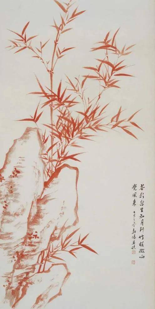 竹是中国传统文化中极具理想人格的四君子之一,象征着正直、坚韧与气节,“峻节可临戎,虚心宜待士”,兼有刚劲与温和的品质。又因为“祝”的谐音之故,寄托着平安祥瑞的美好寓意,“爆竹声中一岁除,春风送暖入屠苏”,人们在响彻云霄的新年氛围中迎喜纳福、憧憬未来。朱砂自商周以来被视为驱邪避凶、镇宅护佑的纯阳之物,该作品以清代朱砂老墨和民国旧纸为材质,纸墨相发,不拘形似,表达了清新脱俗、吉庆祥和的新年祝愿。