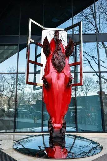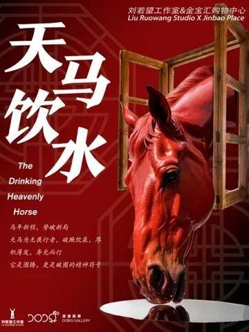 当马年向我们走来,仿佛每个人心中都奔驰着一匹俊美飘逸的骏马。作为人类最亲密的朋友之一,马贯穿了整个文明发展史,被赋予了自由、力量、勇气、成功、财富等诸多美好寓意。今天,刘若望工作室出品的“天马饮水”大型雕塑,将为人们带来更多的美好与喜悦。高达六米的巨大红色马头从马厩窗户中伸出头来,静静畅饮生命之水。这是一匹即将载着理想飞奔的破局之马,它寄托着身处不确定时代的我们,对未来一切美好的期盼。没有飞扬的姿态,但一切正蓄势而发,饱满的面颊令人遐想那健壮的身躯,沉静的眼神流露的是稳健、不可摧毁的内在力量。