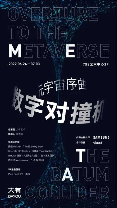发布会同期,在画廊周北京2022数字艺术特别板块展览,「大有艺术」推出元宇宙艺术展《元宇宙序曲——数字对撞机》,展出了费俊、钟飙、田晓磊、回环小组、WHOM(我们1人类2在3火星4)数字艺术团队等艺术家作品。艺术家们借助科技技术从艺术的角度对元宇宙的视觉语言、想象力、互动体验、数字孪生、社会生态等多纬度进行思考和创作表达,用艺术验证元宇宙的想象暨创造是最理想的方式。